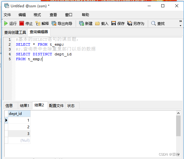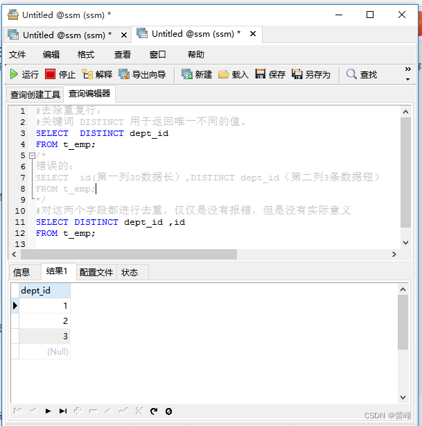 SELECT id(第一列30数据长),DISTINCT dept_id(第二列3条数据短)