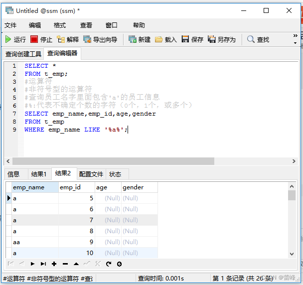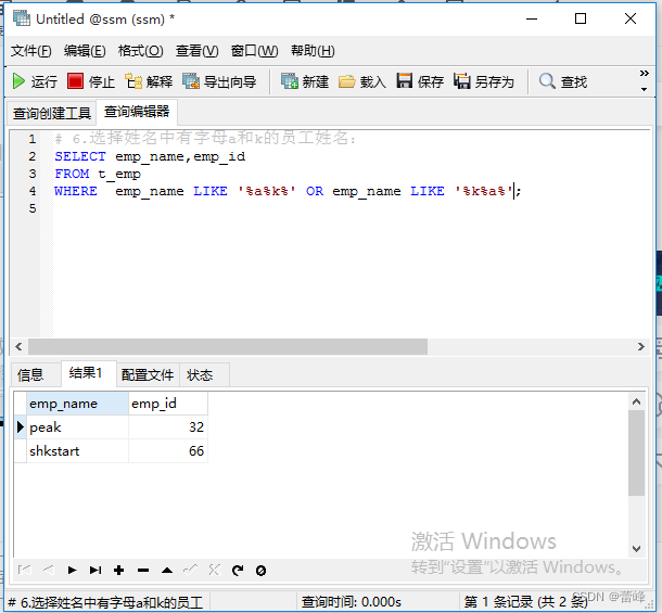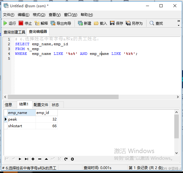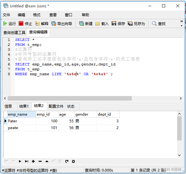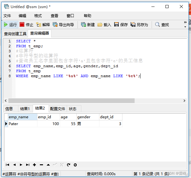 查询员工名字里面包含字符'a'且包含字符'e'的员工信息: