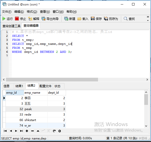 8.显示出表dept_id部门编号在2-3之间的姓名,员工id