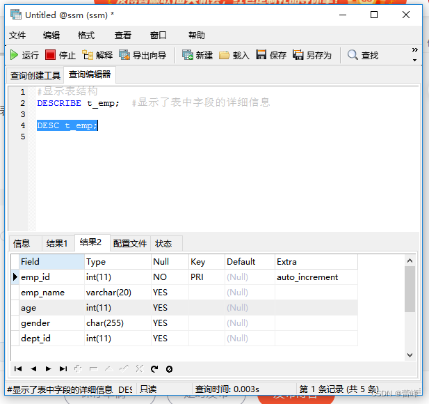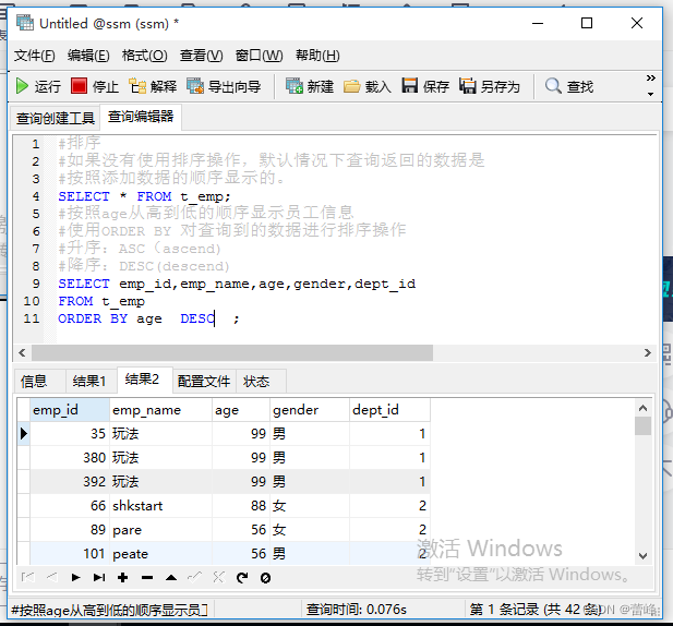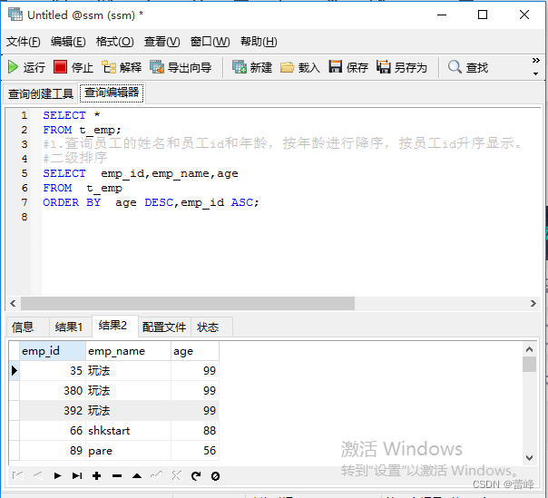 1.查询员工的姓名和员工id和年龄,按年龄进行降序,按姓名升序显示。