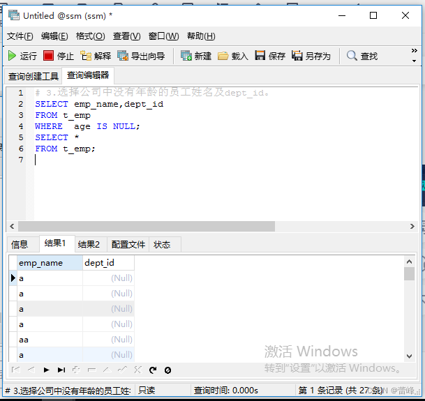 3.选择公司中没有年龄的员工姓名及dept_id。