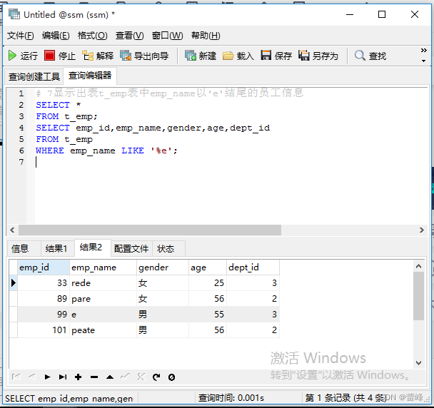 7.显示出表t_emp表中emp_name以'e'结尾的员工信息