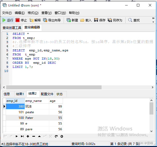 2.选择年龄不在18-30的员工的姓名和id,按id降序,显示第2到8位置的数据