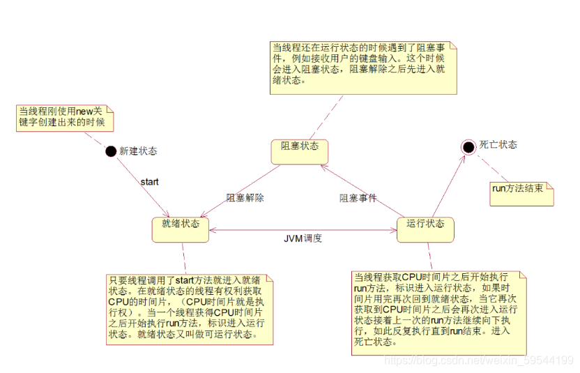 就绪:处于新建状态的线程被start()后,将进入线程队列等待CPU时间片,此时它已具备了运行的条件,只是没分配到CPU资源