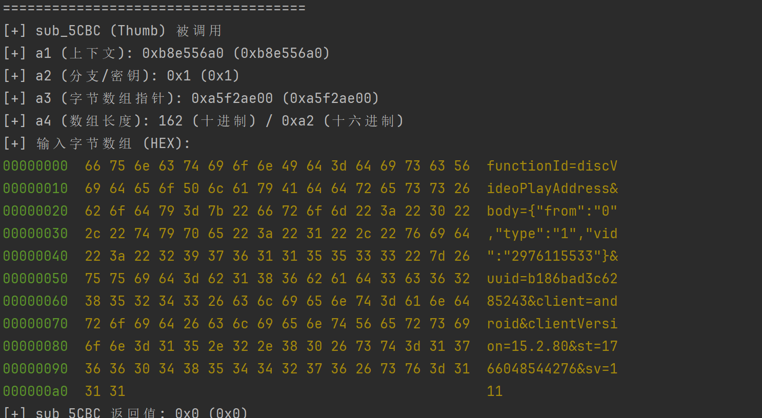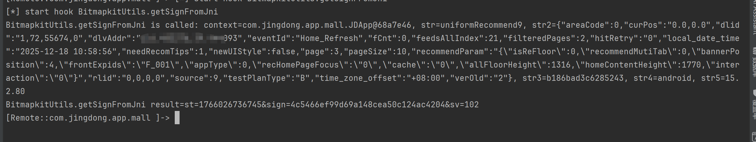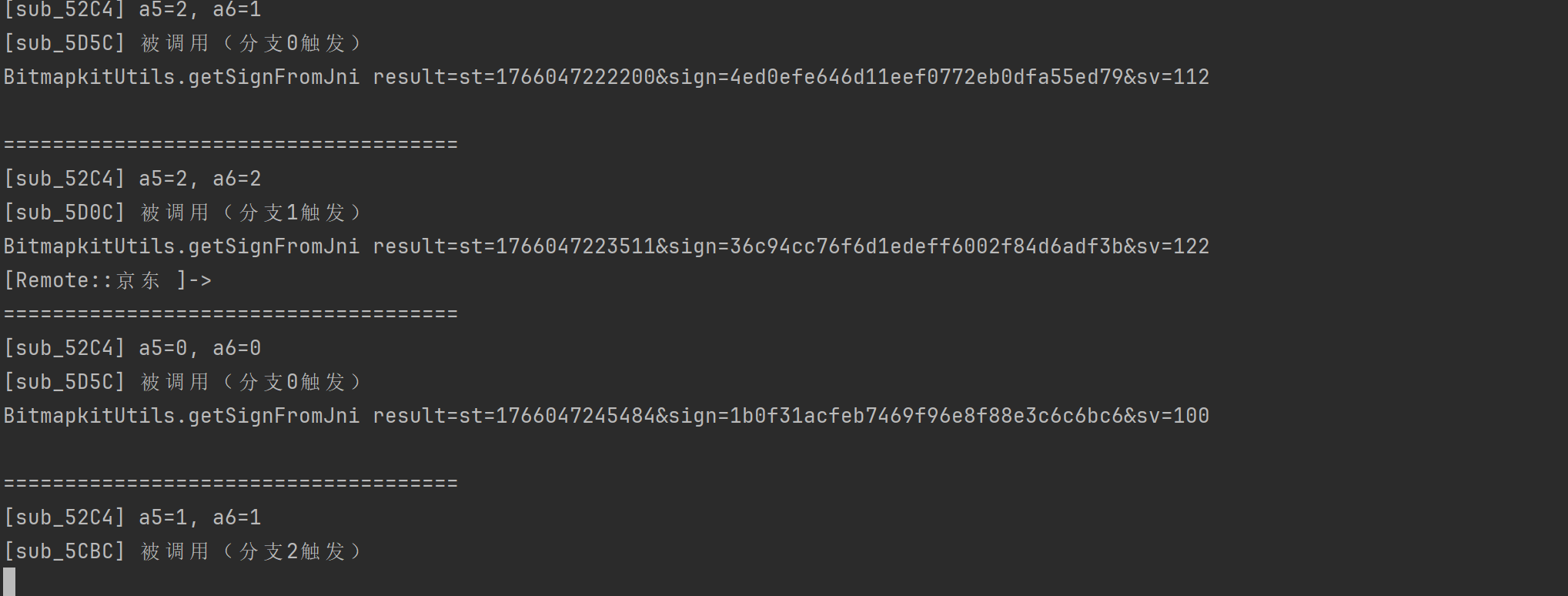 console.log("[*] start hook BitmapkitUtils.getSignFromJni");