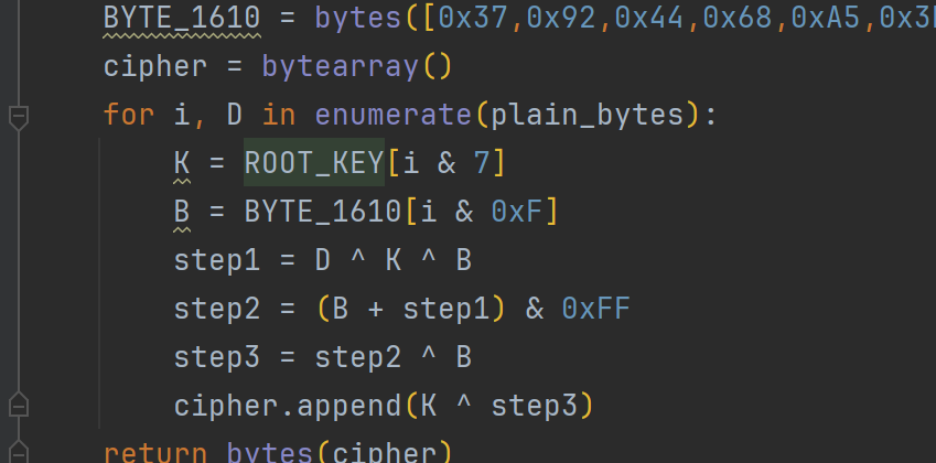 v10 = byte_1610[i & 0xF]; // 步骤5:读取固定16字节数组byte_1610的第(i模16)个字节(补充密钥流)