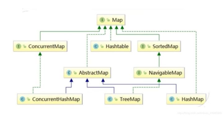 而Map接口是一个顶层接口,下面包含了很多不同的实现类,它是用于对键值对(key:value)进行存储的,继承关系如下图: