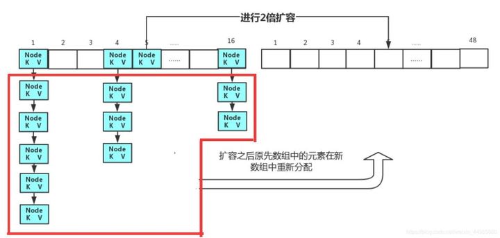 我们上面也提到过,对于初始长度为16的数组,当其中存储的数据长度等于16*0.75=12时。就会对数组元素进行扩容,扩容量是原来数组容量的2倍,也就是当前是15话,再扩容就是扩容32个数据位。