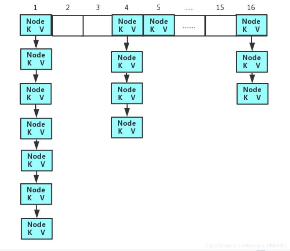 HashMap将将要存储的值按照key计算其对应的数组下标,如果对应的数组下标的位置上是没有元素的,那么就将存储的元素存放上去,但是如果该位置上已经存在元素了,那么这就需要用到我们上面所说的链表存储了,将数据按照链表的存储顺序依次向下存储就可以了。这就是put的简单过程,存储结果如下: