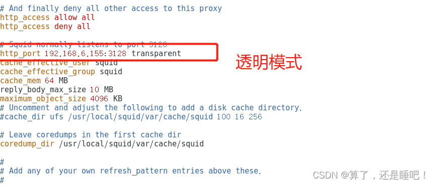 http_port 3128 #用来指定代理服务监听的地址和端口(默认的端口号为 3128)
