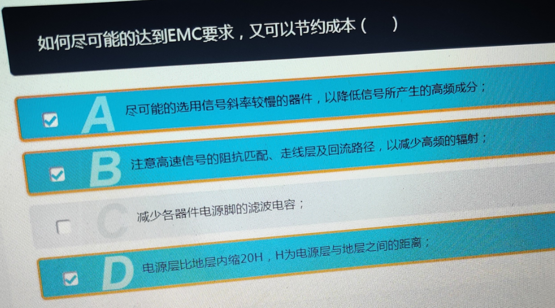 对于高速信号,阻抗不匹配会导致信号反射,产生电磁辐射;不合理的走线层和回流路径会增加信号的电磁辐射。注意高速信号的阻抗匹配、走线层及回流路径设计,可以减少高频辐射,满足 EMC 要求。这些设计主要是在 PCB 设计阶段进行优化,不需要额外增加大量成本,B 正确。