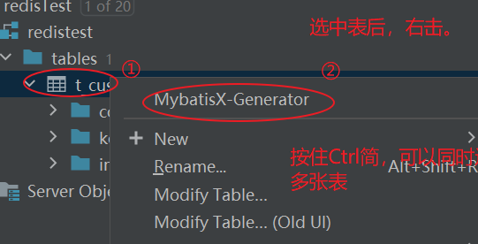 选中表后右击(按住Ctrl或Shift点击,可以选中多个),然后右键选择MybatisX-Generator