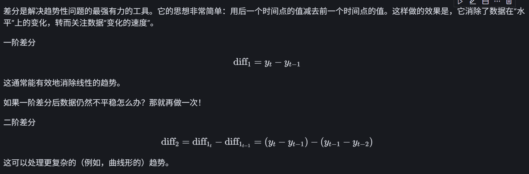 通过昨天的ADF检验,我们发现p值显著大于0.05,这表明数据是非平稳的。通常,这意味着数据存在趋势(Trend),比如股价长期来看在上涨,或者销量逐年递增。