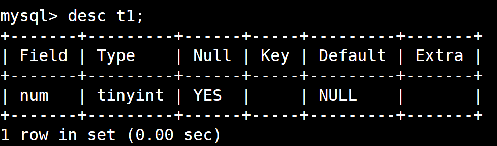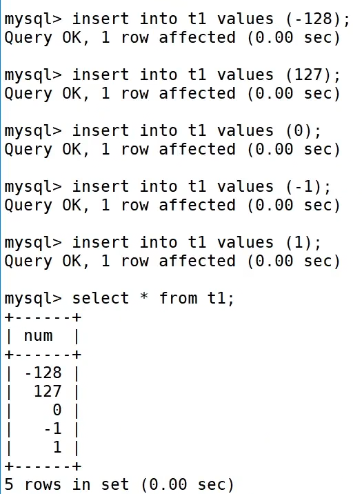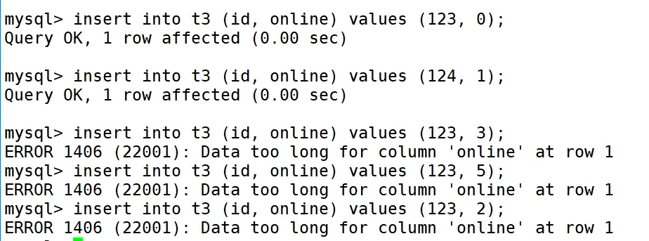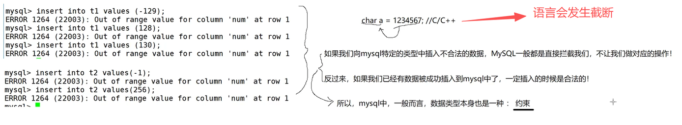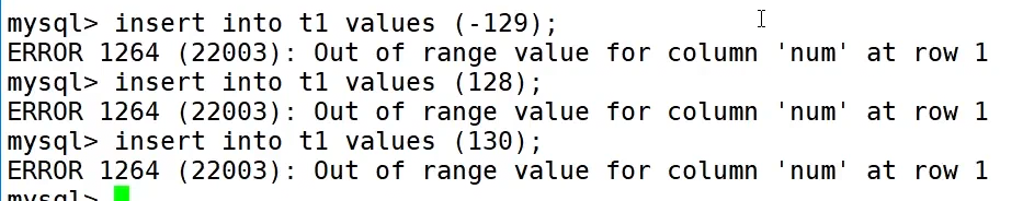 插入的数值超过范围的话,直接会报错(有符号-128 <-> 127)