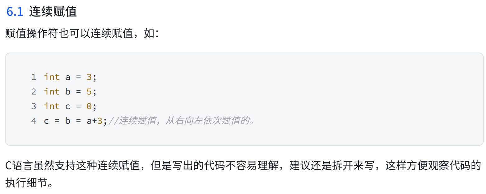 C语言支持连续赋值(从右往左),但是其他的语言不一定支持,(就算支持,执行的顺序也不一定是一样的)所以最好不要这样写