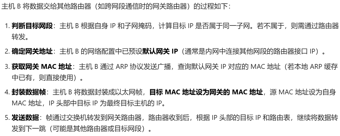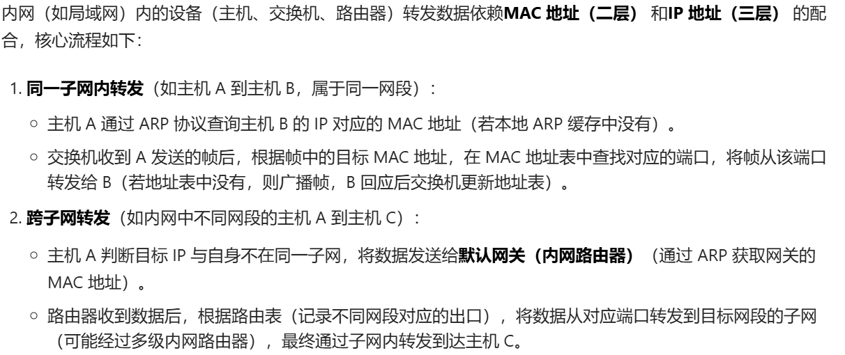 先根据字节的网段进行判断,是否在内网进行转发,如果不一样就发送给路由器,进行外网转发