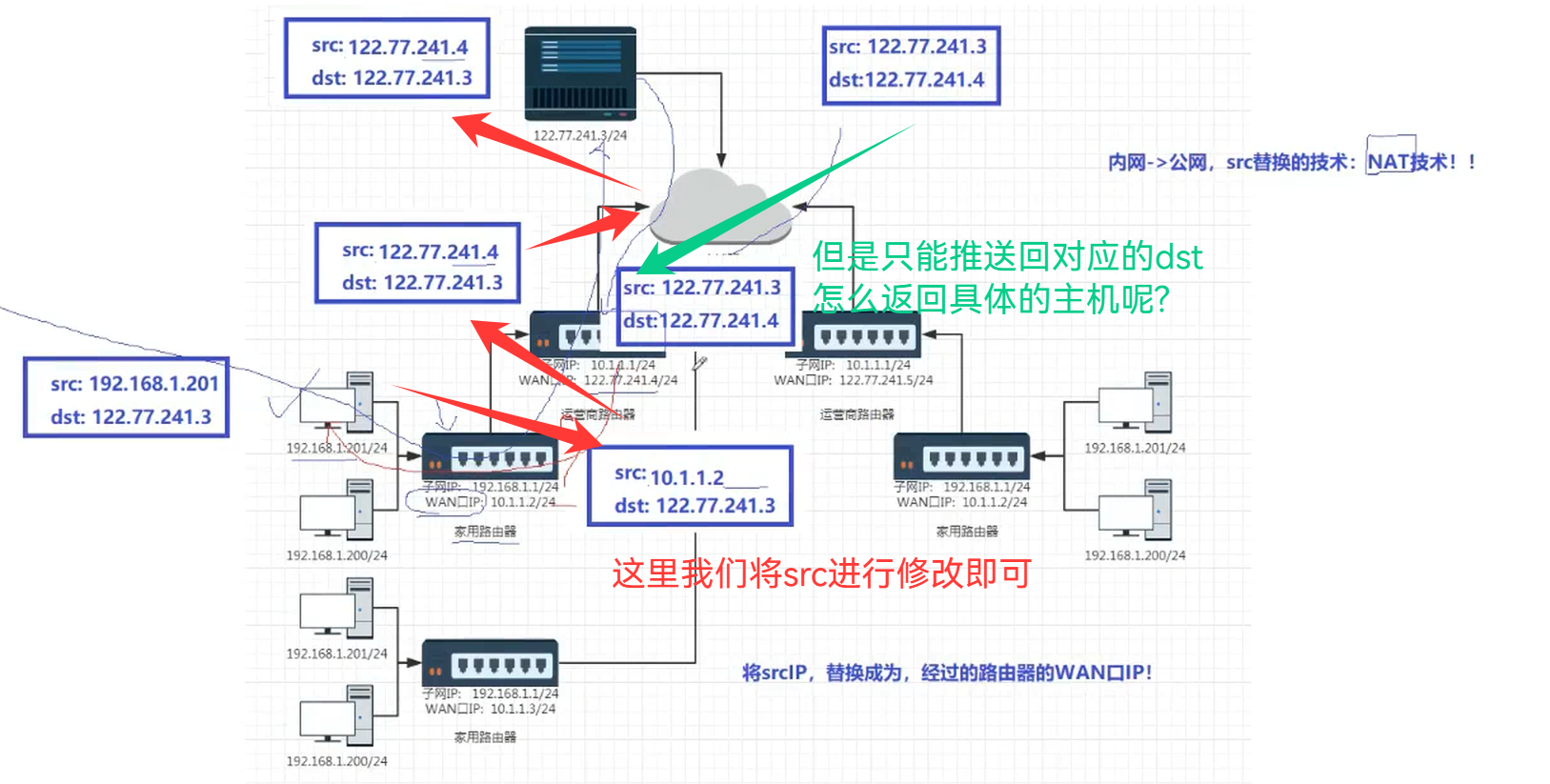 该dstIP是私网IP,整个公网中有很多该IP,所以一定是无法转回来的,那怎么办?