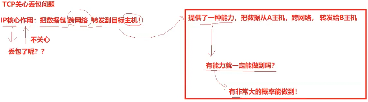 IP就是将数据进行转发,但是伴随着丢包的风险,但是TCP会进行超时重传,一次丢包没关系,那就再进行传递