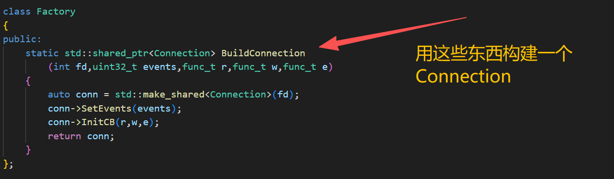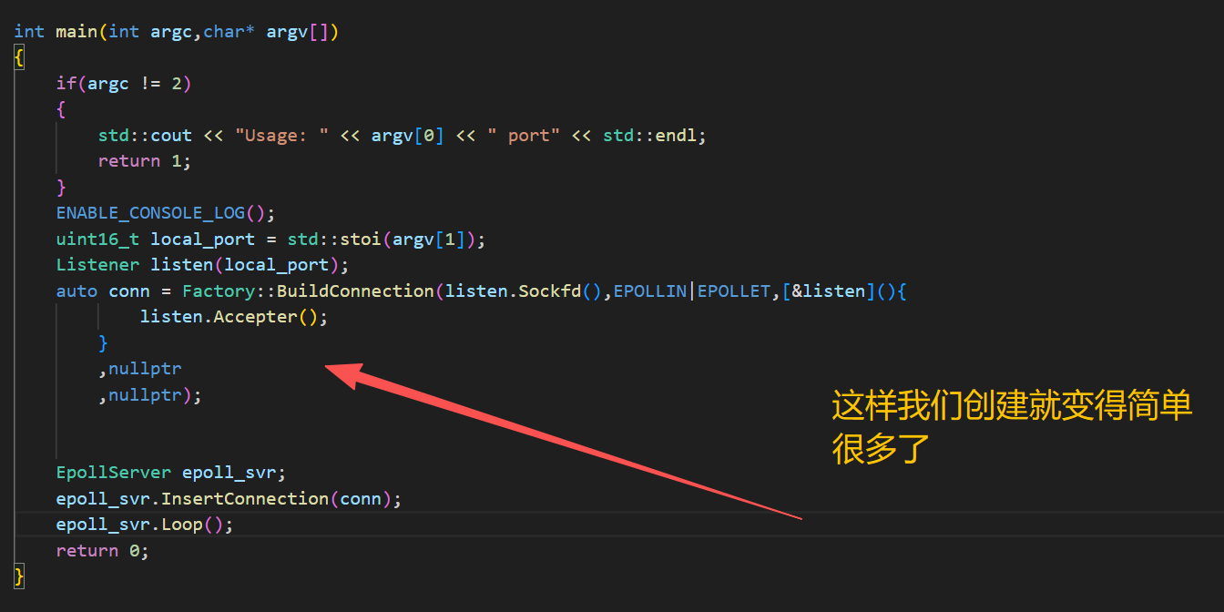 auto conn = Factory::BuildConnection(listen.Sockfd(),EPOLLIN|EPOLLET,[&listen](){