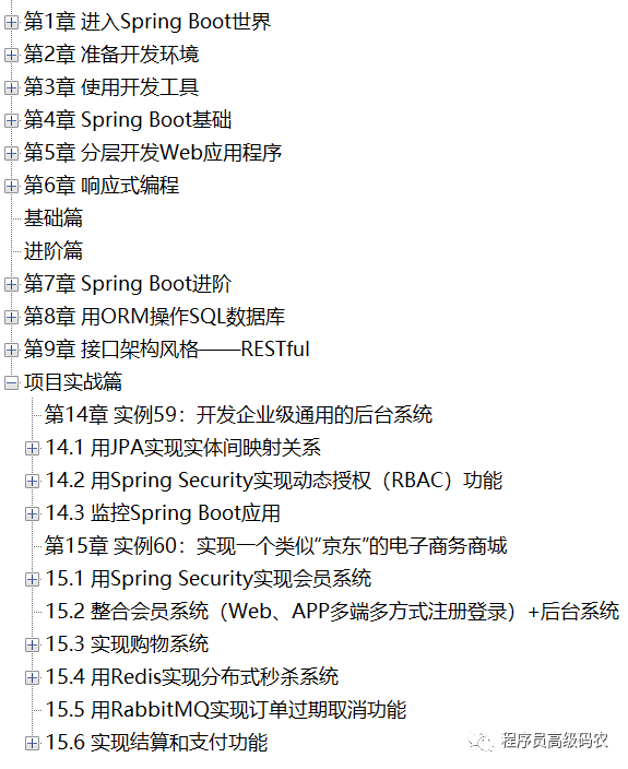 本文内容分为入门篇、基础篇、进阶篇、项目实战篇四大部分,采用“知识点+实例”的形式编写,通过“58 个基于知识的实例+2个综合性的项目”,全面深入地讲解了Spring Boot的主要技术原理和应用。限于文章篇幅原因,只能以截图的形式展示出来,有需要的小伙伴可以文末获取↓↓↓