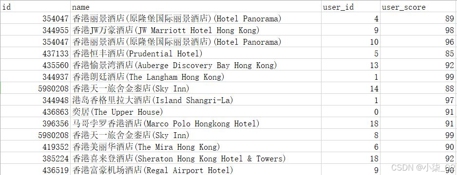 本实训使用的数据是从携程网采集到的用户对香港境内酒店评分的数据(用户信息已经脱敏)。该数据已经保存成了一个类似于excel表格文件的形式,可以把数据看成是一个表格。这个表格有4列,分别为id,name,user_id,user_score。其中id表示酒店ID,name表示酒店名称,user_id表示用户ID,user_score表示用当前户对该酒店的评分。部分数据截图如下图所示: