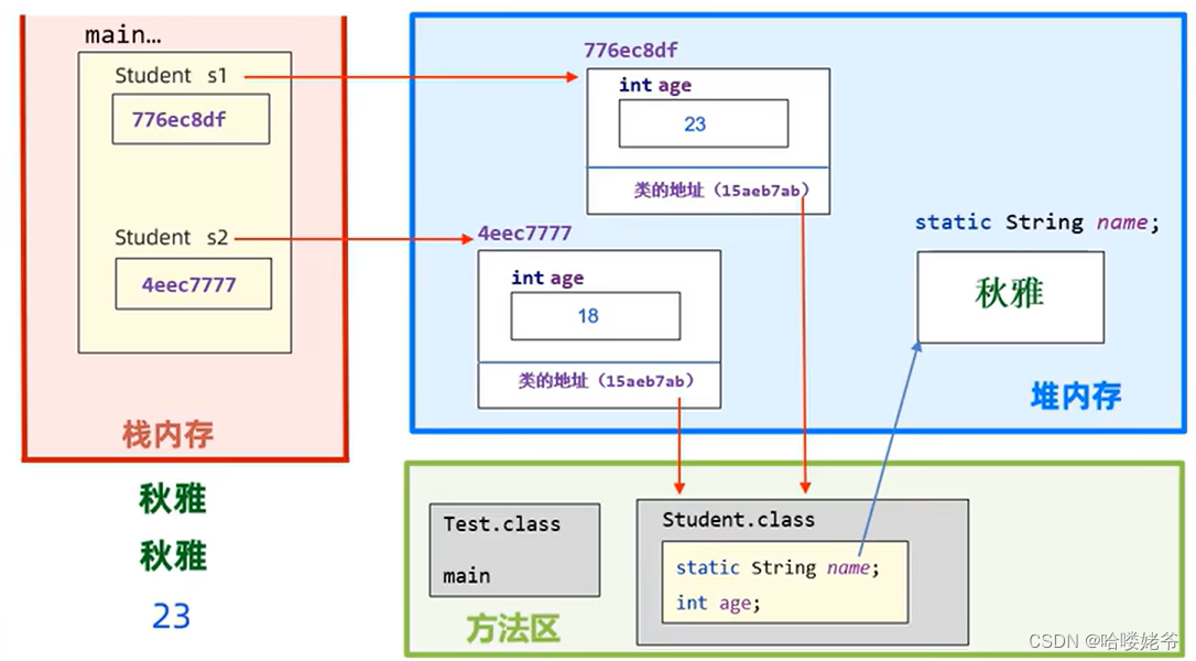 运行第七行代码:给s2中的name赋值,就是给堆中static String name空间赋值,将原有的覆盖掉,然后他就变成了"秋雅"。