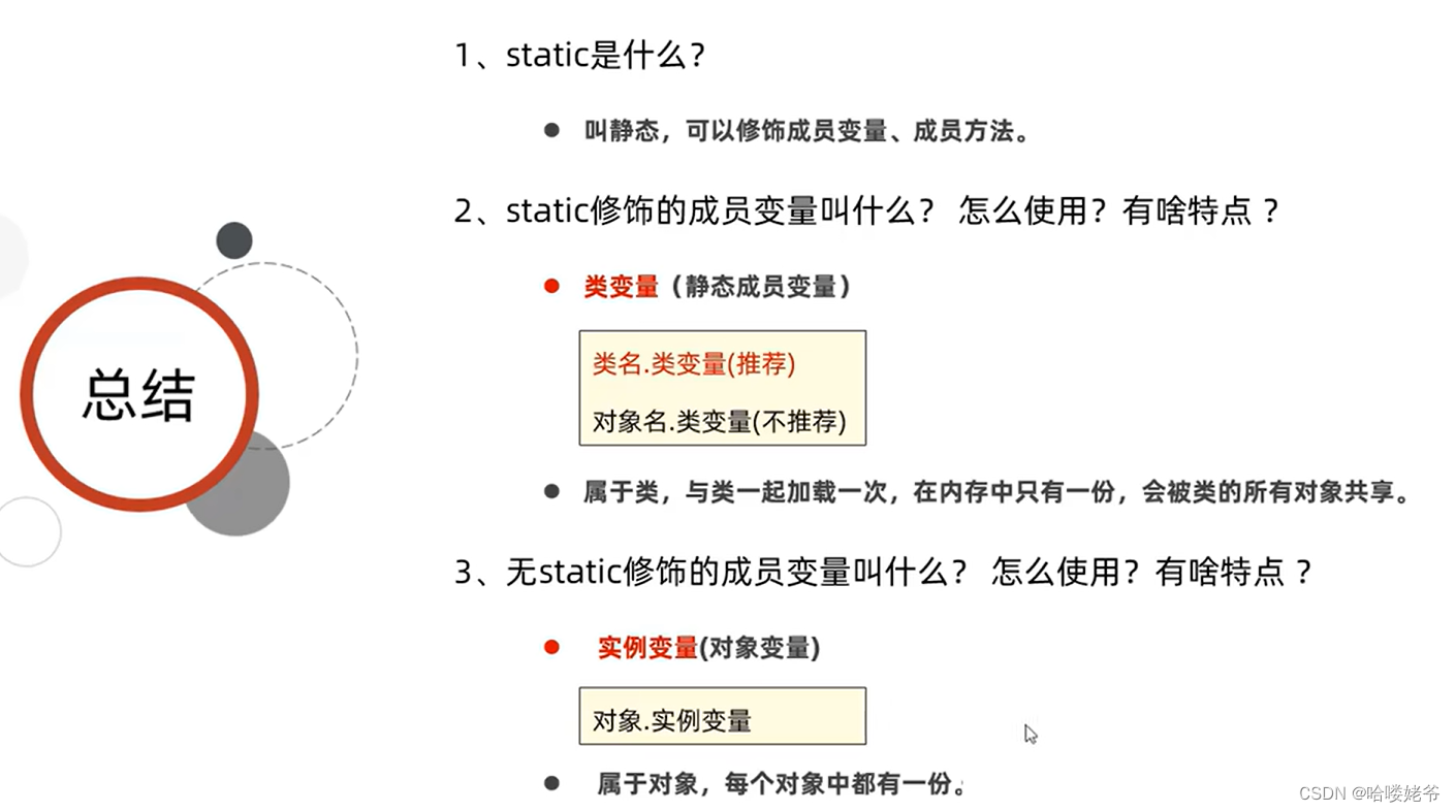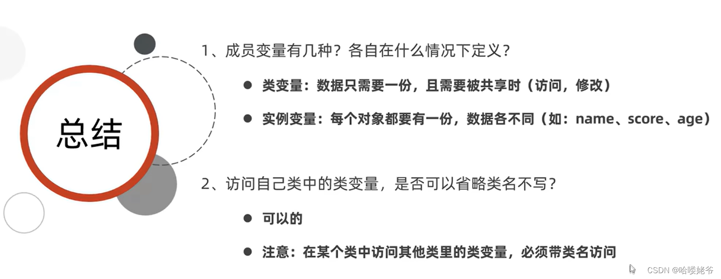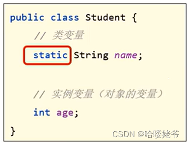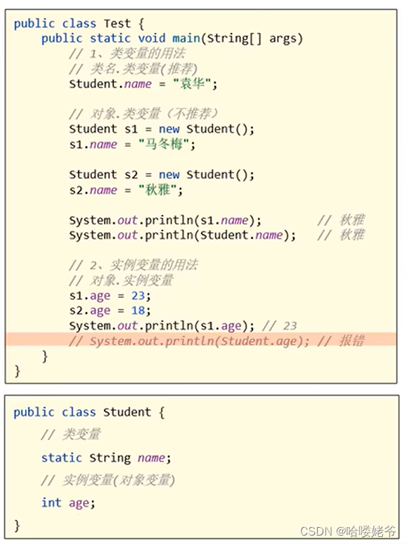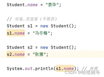 ①类变量:有static修饰,属于类,在计算机里只有一份,会被类的全部对象共享(不管那个类调用的,都是使用这一个变量,用的都是同一个地址,使用你上面给它赋值,然后下一行代码有赋值,就是改变了他的内容,不管说不定同一个new出来的)。