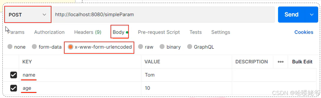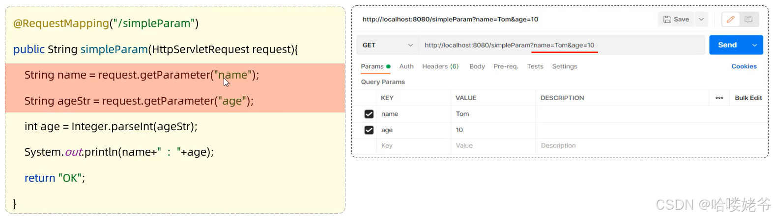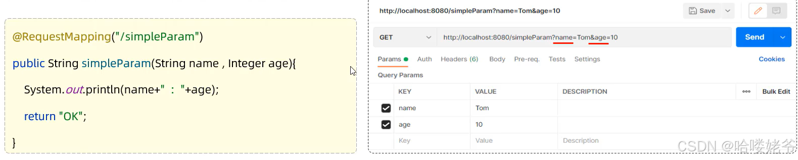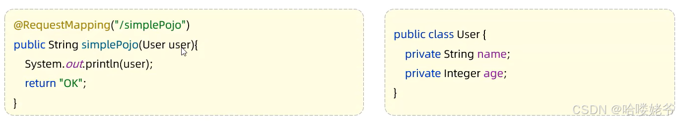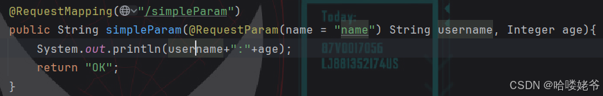 简单参数:参数名与形参变量名相同,定义形参即可接收参数。