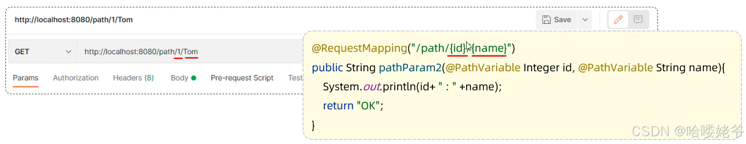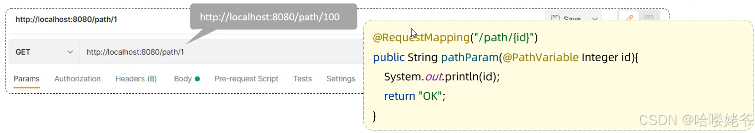 路径参数:通过请求URL直接传递参数,使用{...}来标识该路径参数,需要使用@PathVariable获取路径参数