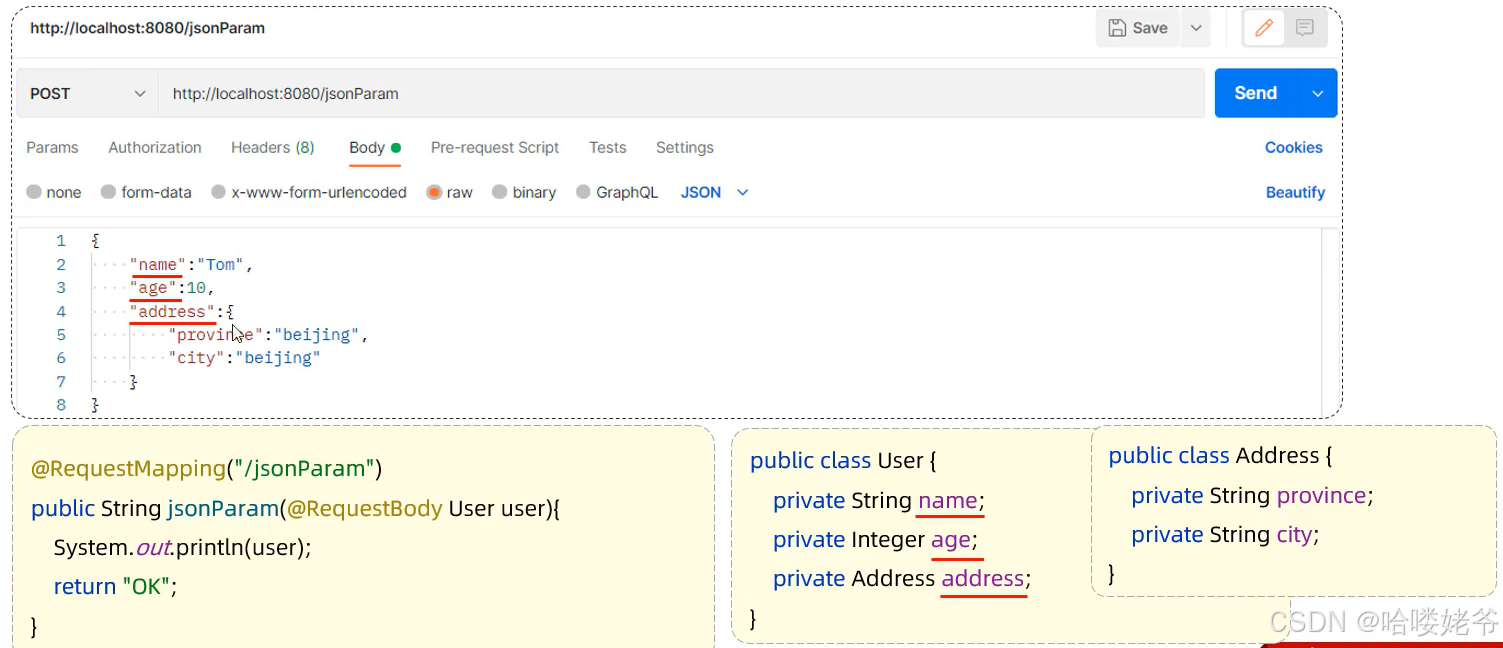 JSON参数:JSON数据键名与形参对象属性名相同,定义JSON类型形参即可接收参数,需要使用@RequestBody标识