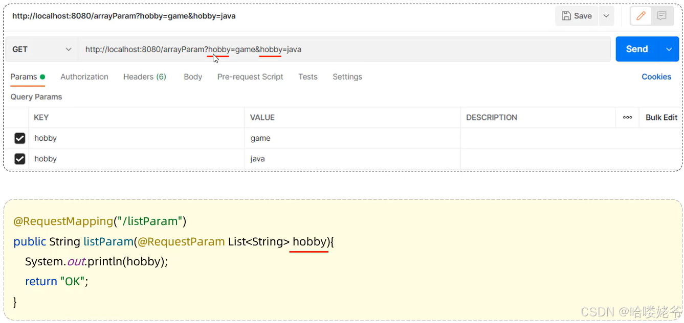 数组参数:请求参数名与形参数组名称相同且请求参数多个,定义数组类型形参即可接收参数