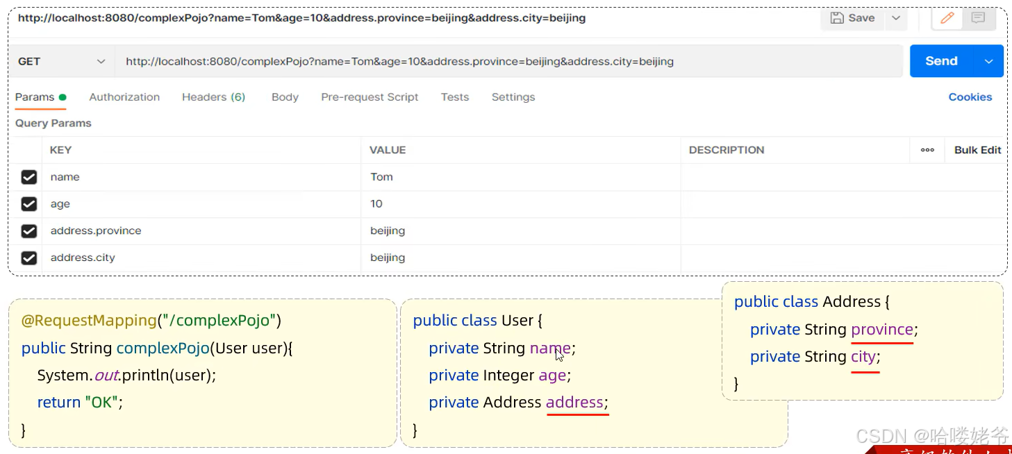 复杂实体对象:请求参数名与形参对象属性名相同,按照对象层次结构关系即可接收嵌套POJO属性参数