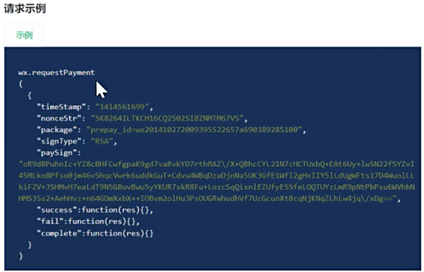 微信小程序调起支付:通过JSAPI下单接口获取到发起支付的必要参数prepay_id,然后使用微信支付提供的小程序方法调起小程序支付