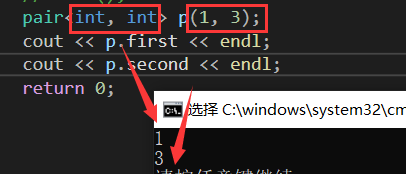 上面是我模仿pair的基本结构自己写的简单代码。可以发现,这是一个模板类,需要给定类型,其中成员frist存储k,second成员存v。库中同样存在实现,放在std命名空间下的: