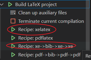 首先要说明,若编辑latex时没有引用文献,那么只用xelatex编译一次就可以;若引用了文献,要按以下次序编译xelatex、bibtex、xelatex、xelatex。若复制了我文末的配置,在vscode中可以直接用以下两个快捷键执行上述操作: