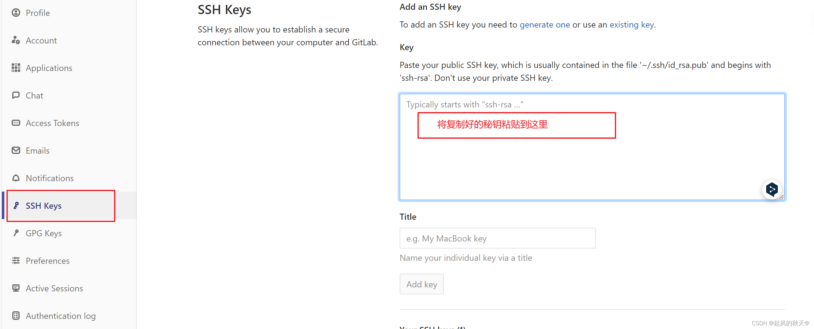 复制以上生成的SSH Key,到Gitlab打开【设置】–> 【SSH密钥】 --> 粘贴到Key(公钥)中,点击添加就完成了