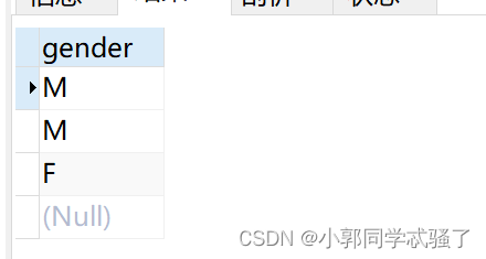 INSERT INTO t VALUES('M'),('1'),('f'),(NULL);
