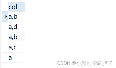 insert into t values('a,b'),('a,d,a'),('a,b'),('a,c'),('a');
