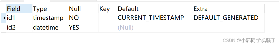 - TIMESTAMP收MYSQL的版本影响比较大(在5.6.6版本之后增加了控制参数explicit_defaults_for_timestamp(explicit_defaults_for_timestamp 系统变量决定 MySQL 服务端对timestamp列中的默认值和 NULL 值的不同处理方法。),如果设置为on,TIMESTAMP需要显式指定默认值和ON UPDATE CURRENT_TIMESTAMP属性;如果设置为off,则会自动设置默认值为CURRENT_TIMESTAMP(系统时间)和ON UPDATE_TIMESTAMP属性,并自动设置为NOT null。MYSQL8.0.2后参数默认为on,之前的版本默认为off)