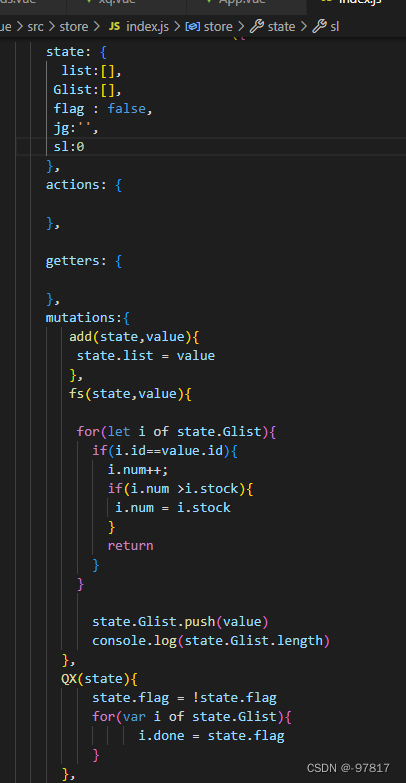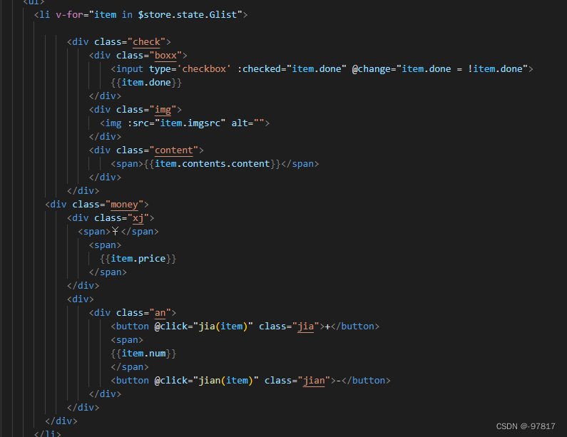点击添加购物车 点击加入购物车 把当前数据后增到vuex的数组:list:[] 里边 , 购物车页拿 到vux的list数据 渲染到页面上
