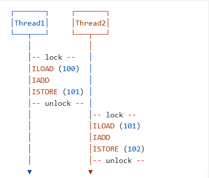 通过加锁和解锁的操作,就能保证3条指令总是在一个线程执行期间,不会有其他线程会进入此指令区间。即使在执行期线程被操作系统中断执行,其他线程也会因为无法获得锁导致无法进入此指令区间。只有执行线程将锁释放后,其他线程才有机会获得锁并执行。这种加锁和解锁之间的代码块我们称之为临界区(Critical Section),任何时候临界区最多只有一个线程能执行。