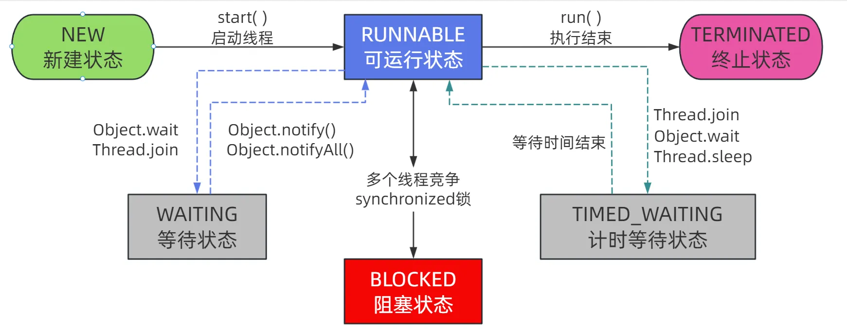 在Java程序中,一个线程对象通过调用start()方法启动线程,并且在线程获取CPU时,自动执行run()方法。run()方法执行完毕,代表线程的生命周期结束。整个线程的生命周期中,线程的状态有以下6种: