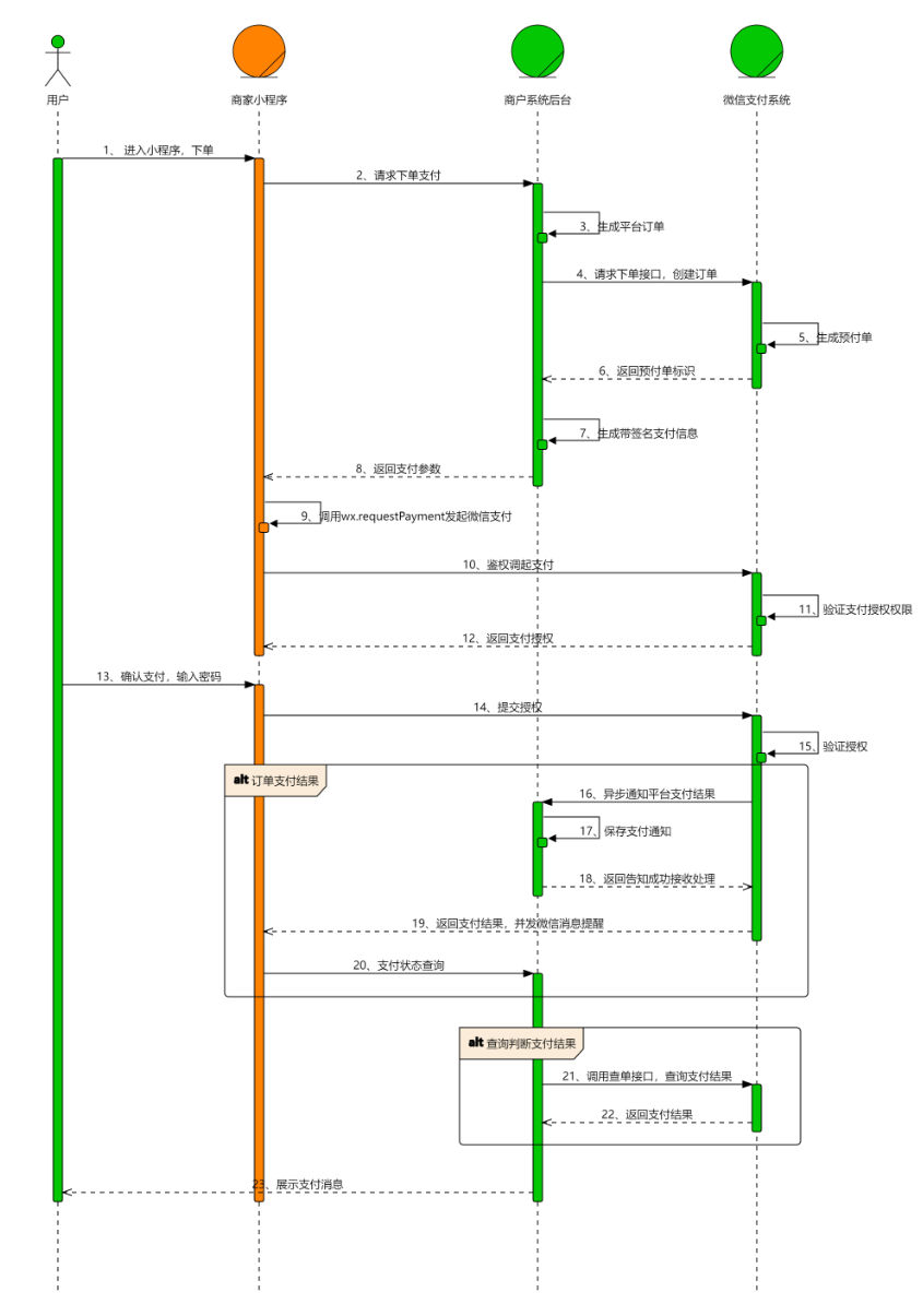 - 为后续支付请求铺路:生成的“带签名支付信息”会被传递给商家小程序(第8步),小程序再带着这些信息调用微信支付接口(第9步