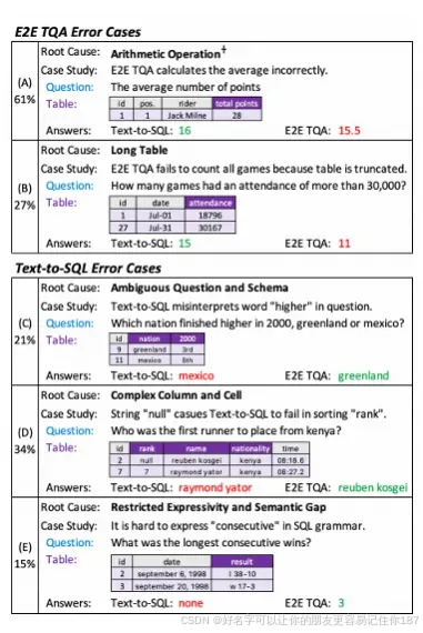 总结一下: 1,Text-to-SQL更擅长算术运算,更擅长长表格;E2E对模糊问题和非标准表格模式有较强鲁棒性,E2E TQA更灵活地处理复杂的表格内容,并且能够处理无法映射到SQL查询的问题。