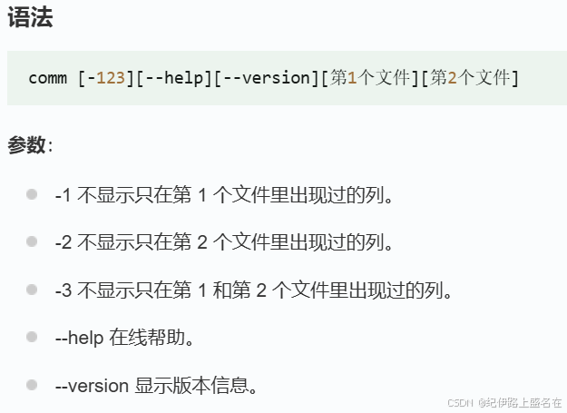 这项指令会一列列地比较两个已排序文件的差异,并将其结果显示出来,如果没有指定任何参数,则会把结果分成 3 列显示:第 1 列仅是在第 1 个文件中出现过的列,第 2 列是仅在第 2 个文件中出现过的列,第 3 列则是在第 1 与第 2 个文件里都出现过的列。若给予的文件名称为 - ,则 comm 指令会从标准输入设备读取数据。