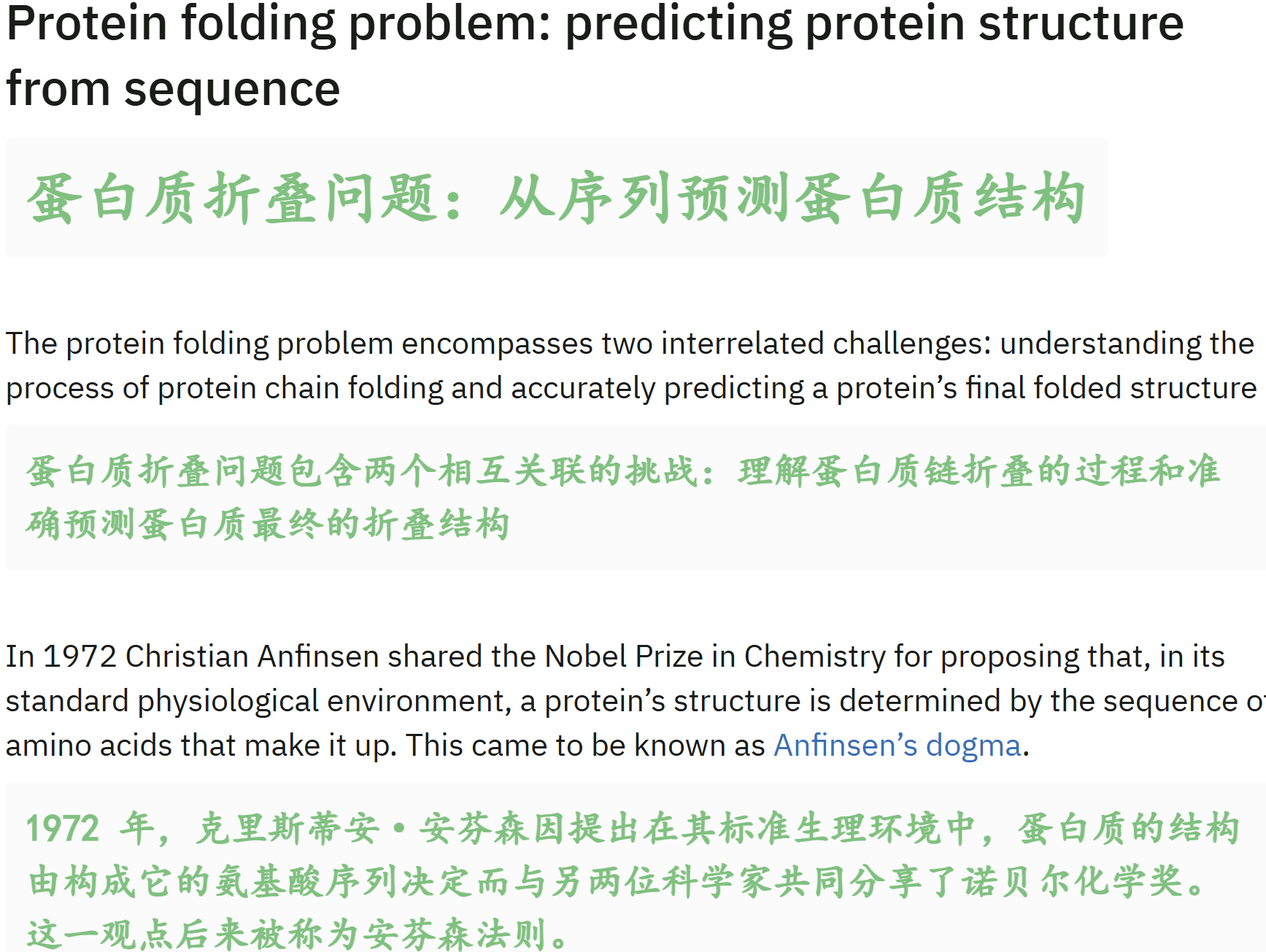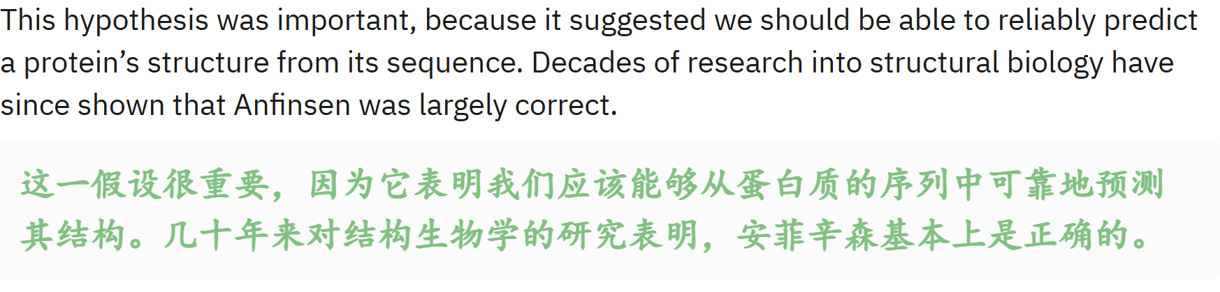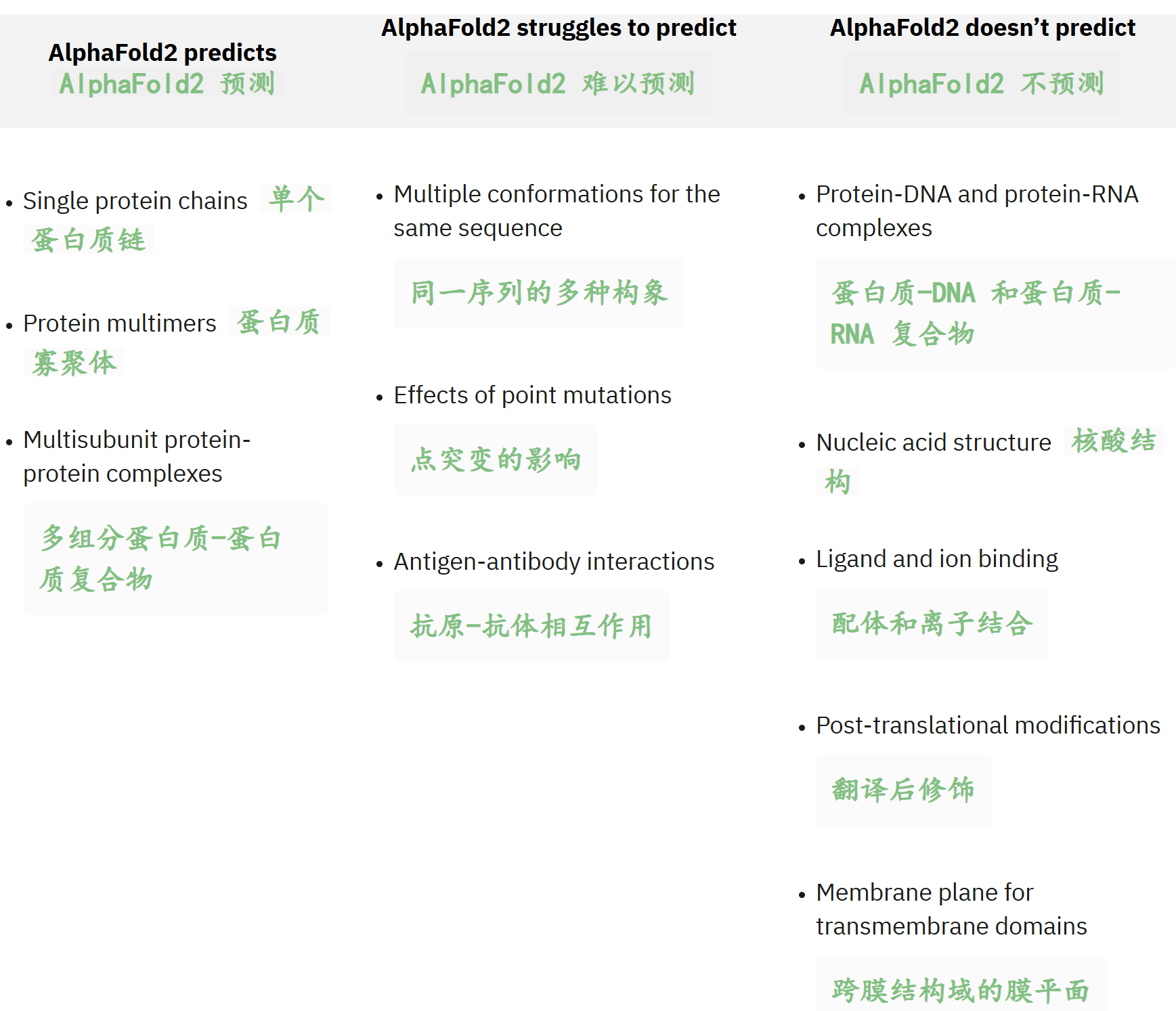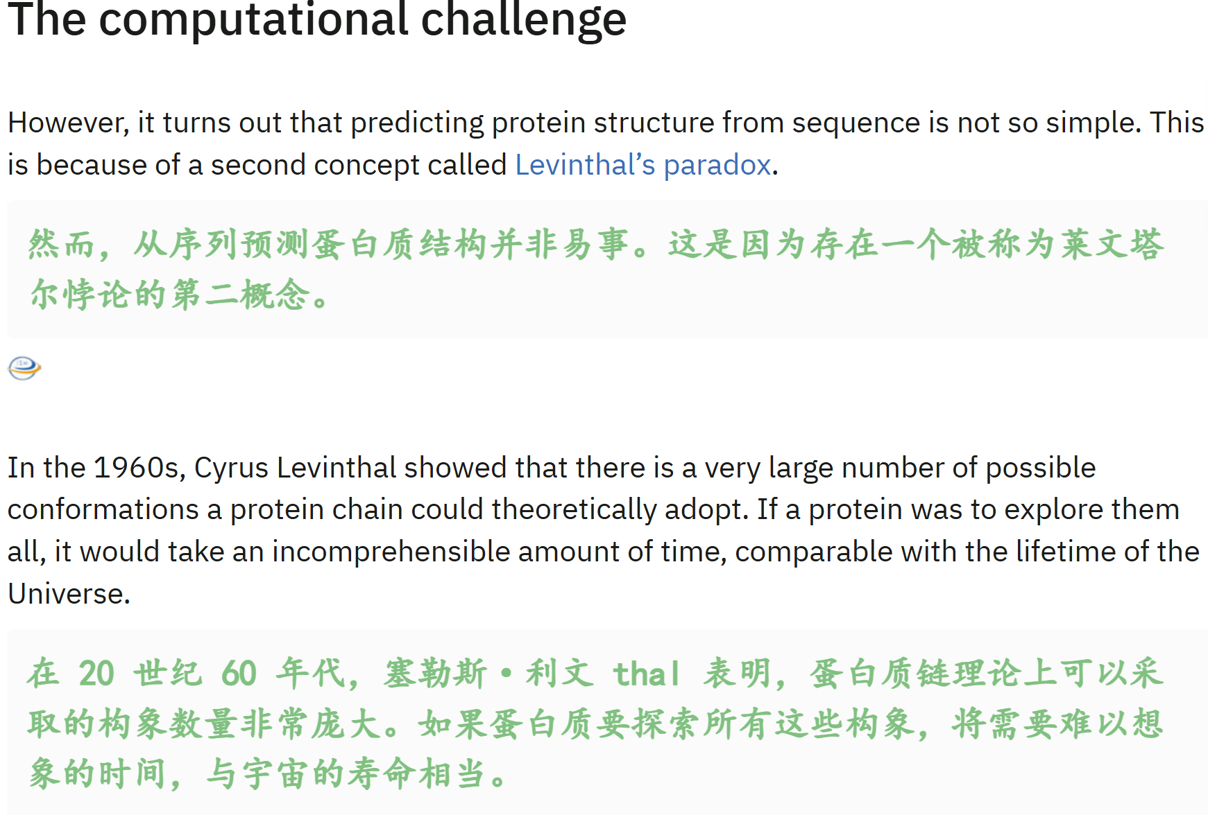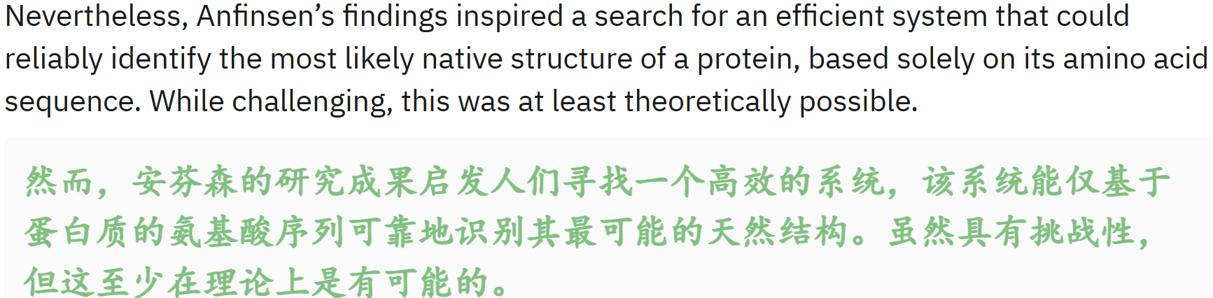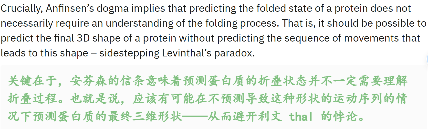 - AI预测的实现其实在实践上进一步验证了“无矛盾性”:现代AI(如AlphaFold)通过学习大量已知的“序列-结构”对应关系,可直接预测蛋白质的最终三维结构,无需模拟折叠过程——这正是安芬森法则的实践体现(序列→结构),同时也避开了莱文塔尔悖论的“过程困境”(无需遍历构象) 。