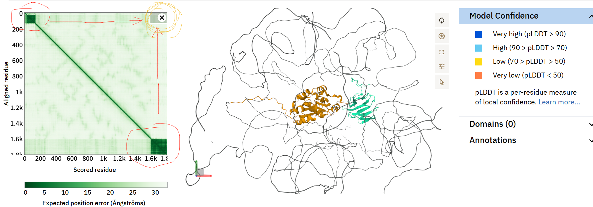 就是下图我圈出来的这个橙色圆圈,我们可以看到(region1,region2)这个区域的PAE分数非常低,说明对于region1和region2之间的相对距离,我们的预测结果是相当没有把握,哦豁,我们的假设泡汤了!