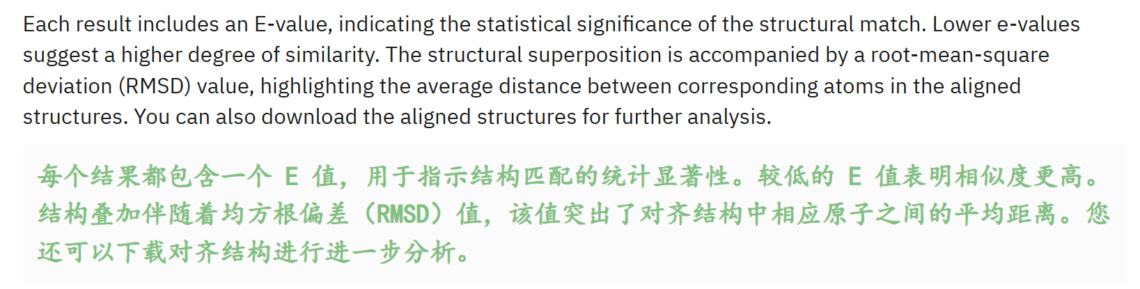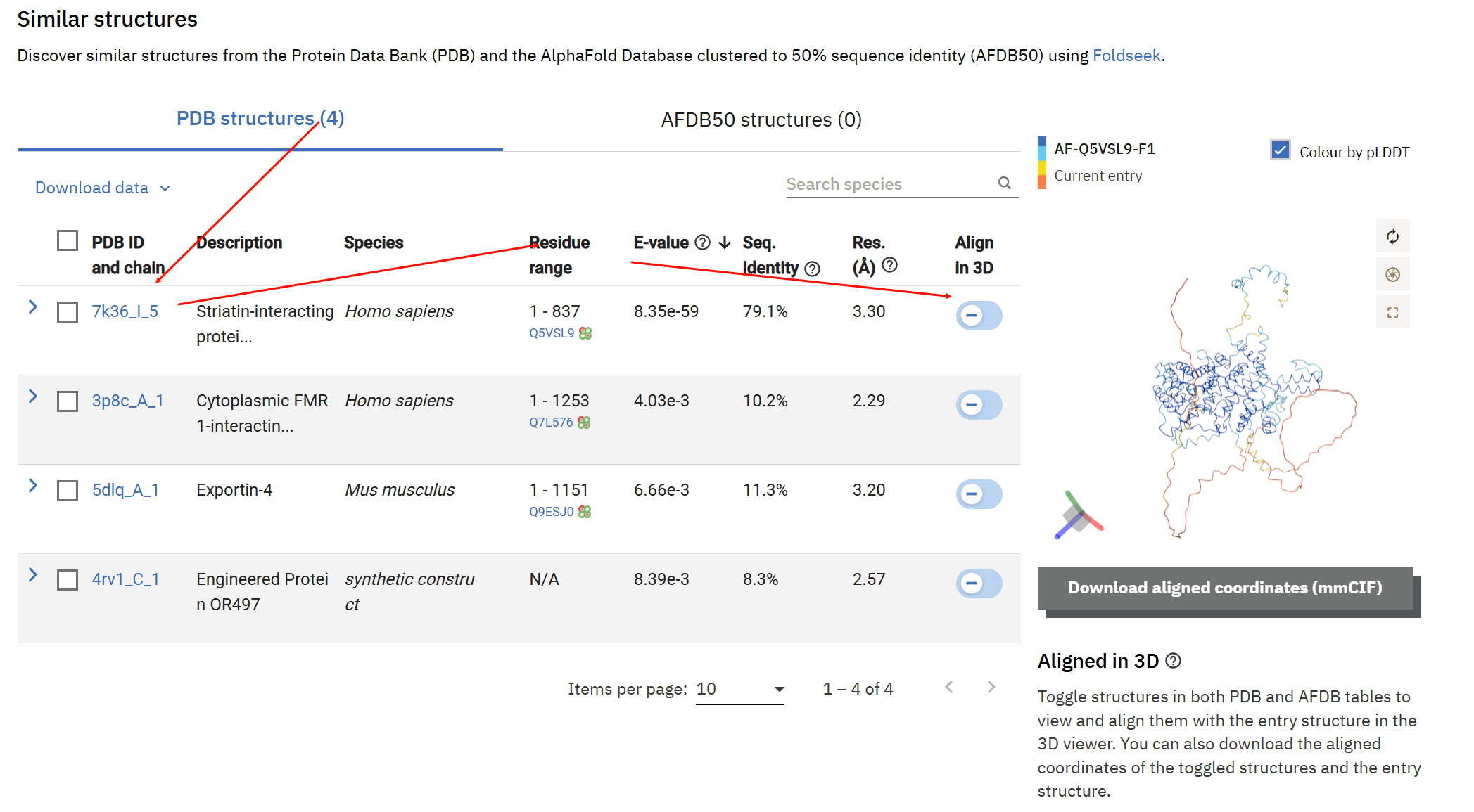 比如说我当前的结构在PDB中就找到了真实的4个相似的实验结构数据条目,还有一些指标,我们主要看E值,还有序列相似度,