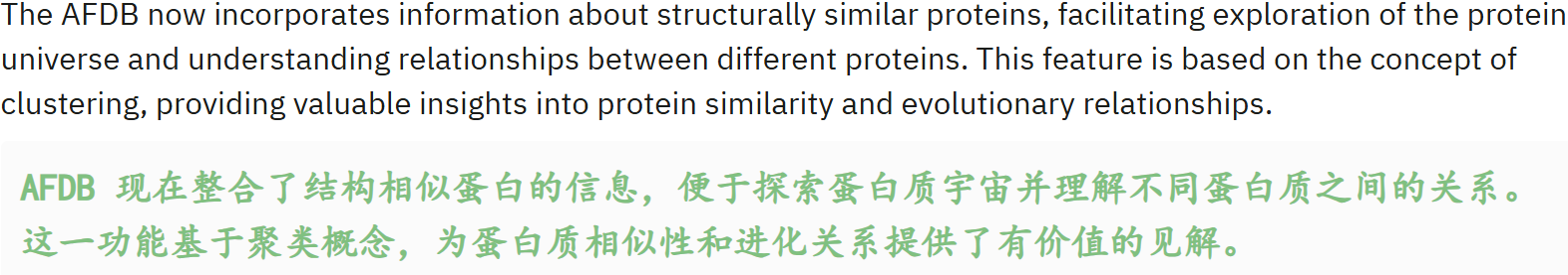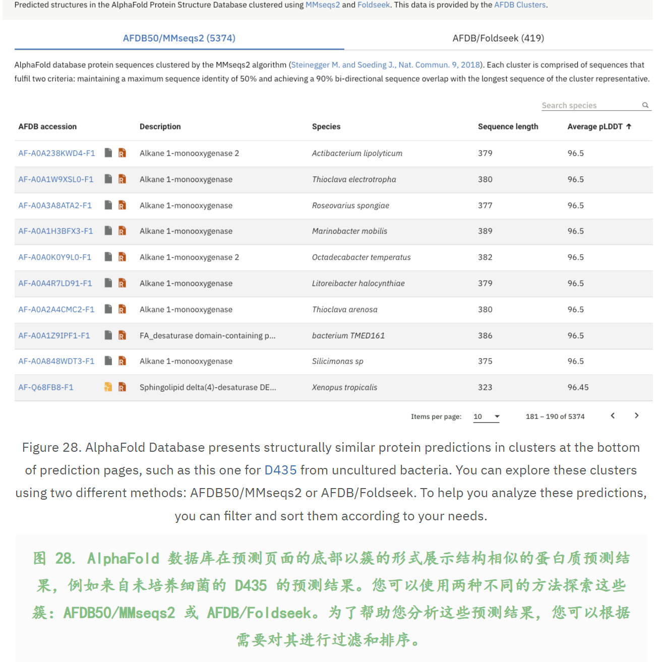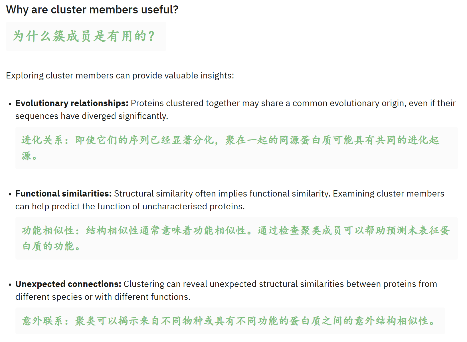 在 AFDB 中每个蛋白质的页面上,我们可以发现一个列出其聚类成员的表格。该表格提供了指向同一聚类中其他蛋白质页面的链接,使我们能够快速比较它们的结构并探索潜在的功能关系。