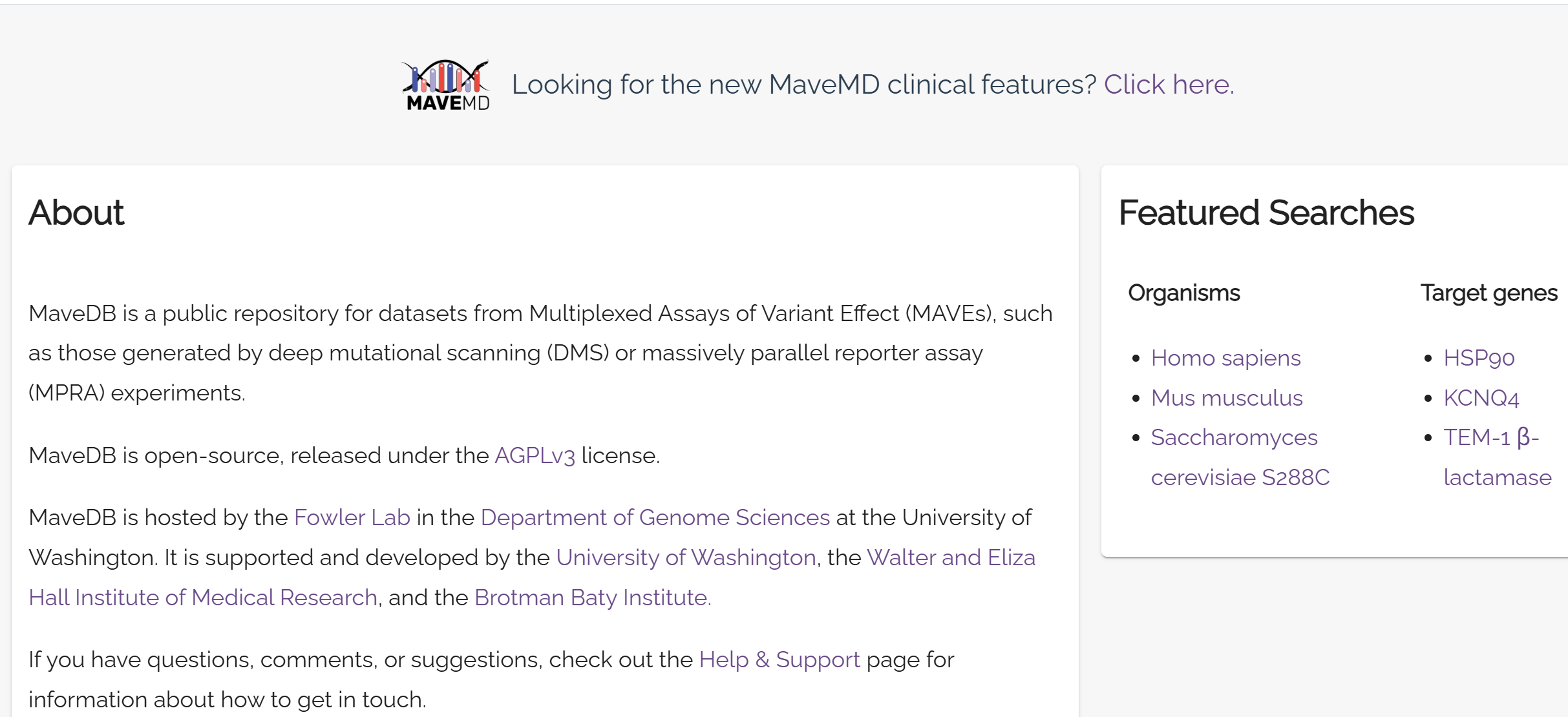 MAVE:https://www.mavedb.org/,MaveDB 是一个用于存储多重变异效应分析(MAVEs)数据集的公共数据库,例如由深度突变扫描(DMS)或大规模平行报告基因检测(MPRA)实验产生。